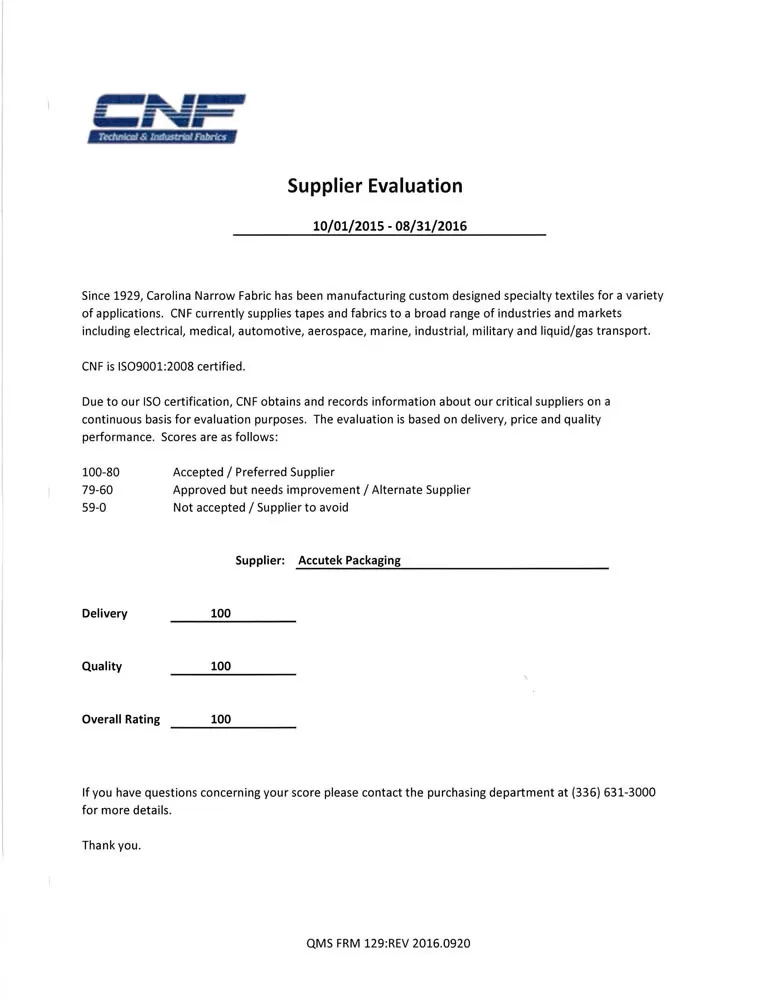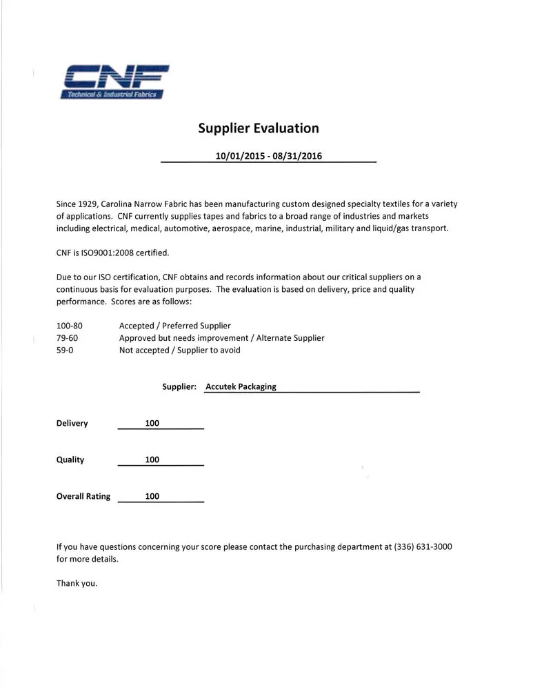 Accutek Scored 100/100 by CNF Supplier Evaluation